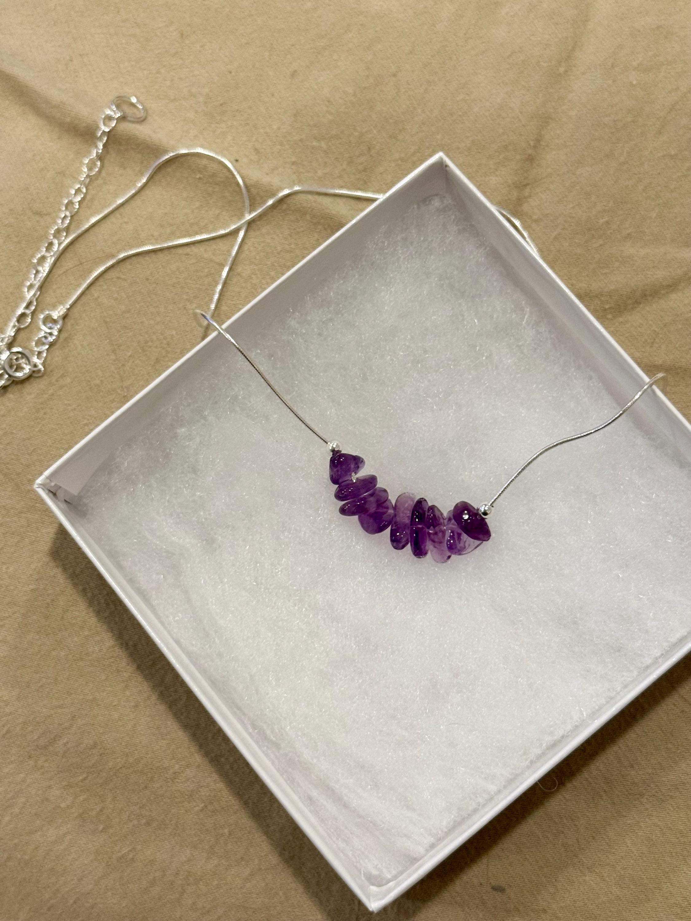 This raw amethyst necklace combines minimalist design with the organic beauty of uncut gemstones, making it a standout addition to any jewelry collection.