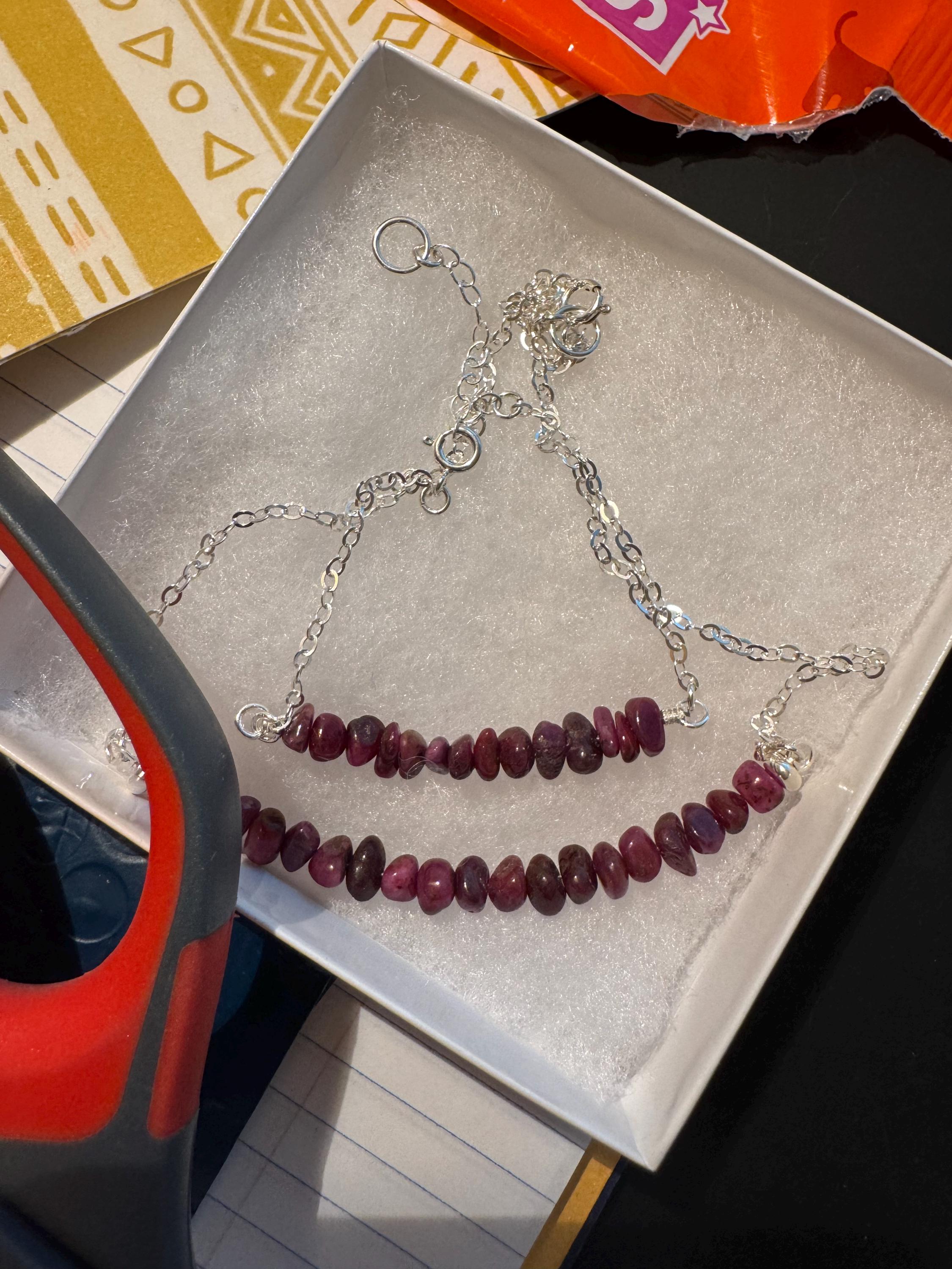 Raw Ruby Bracelet or AnkletThis handcrafted bracelet (or anklet) features a delicate cable chain and a center strand of natural raw ruby chip beads—a stunning fusion of organic texture and refined minimalism. Made with your choice of Sterling Silver or 14K Yellow Gold Filled, this piece celebrates raw beauty and timeless energy.